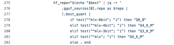 由于 hf-agents 接的是 llama.cpp + GGUF,脚本里专门把 mlx-8bit、mlx-4bit、mlx-3bit 映射成 Q8_0、Q4_K_M、Q3_K_M 这样的 GGUF 量化名。