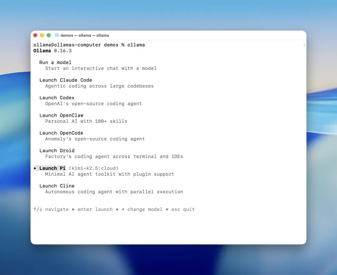 如果不想本地模型驱动,你也可以试试Ollama ,原生命令增加了对 Pi 的支持,一键启动并免配置使用 Kimi-K2.5 云端模型