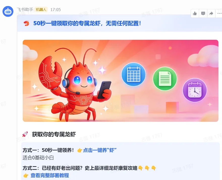 飞书推出了一键部署openclaw小龙虾服务
