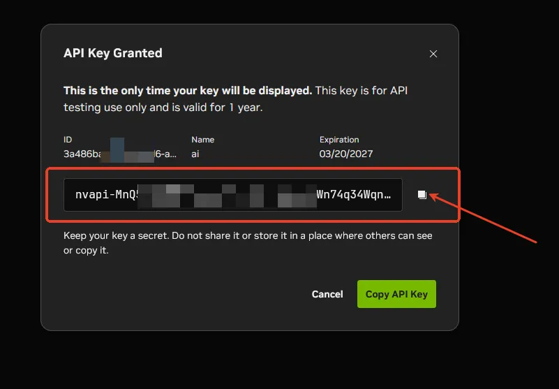 API密钥:nvapi-xxxxxxxxxxxxxxxxxxxxxxxx(粘贴刚才生成的API Key)API地址:https://integrate.api.nvidia.com/v1模型ID:minimaxai/minimax-m2.5