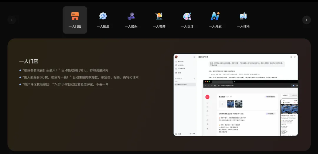 分别是:一人电商、一人跨境电商、一人知识博主、一人开发、一人门店、一人设计、一人制造、一人法律、一人财税、一人猎头。