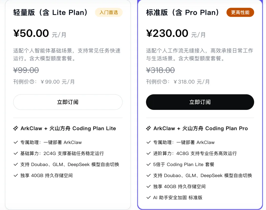 ArkClaw:购买coding plan套餐即可享受一站式自动化部署构建服务,开箱即用拥有完全私密的专属AI体验。注意,ArkClaw单独产品,是coding plan套餐赠送,包含一台2核4g的轻量应用服务器的订阅。