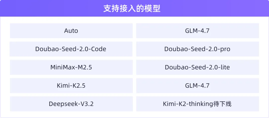 目前ArkClaw支持接入的模型如下