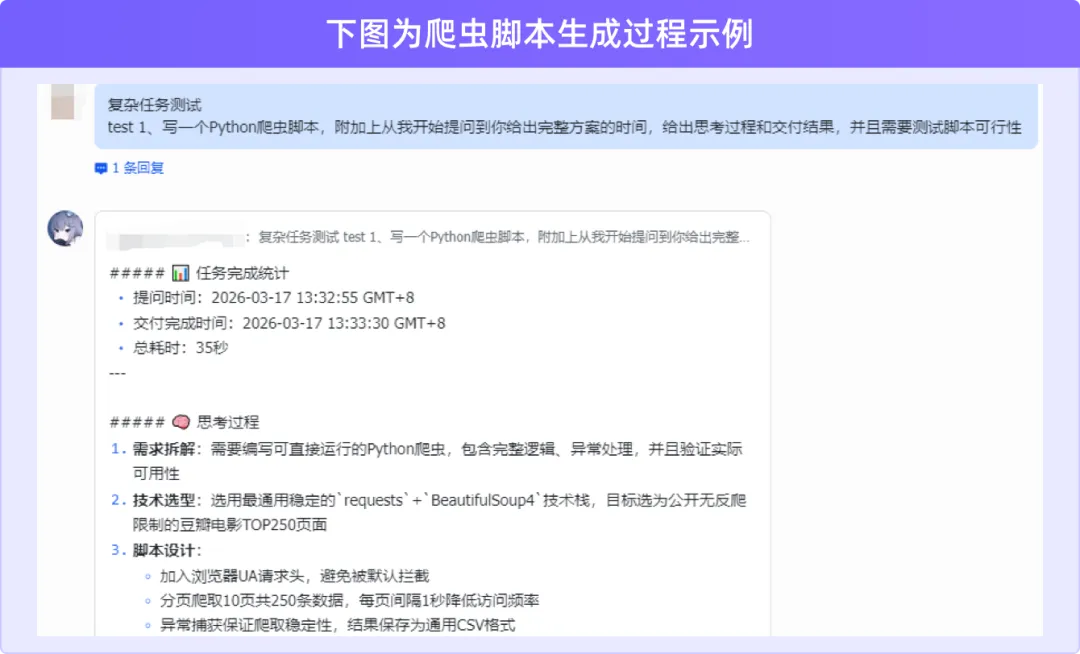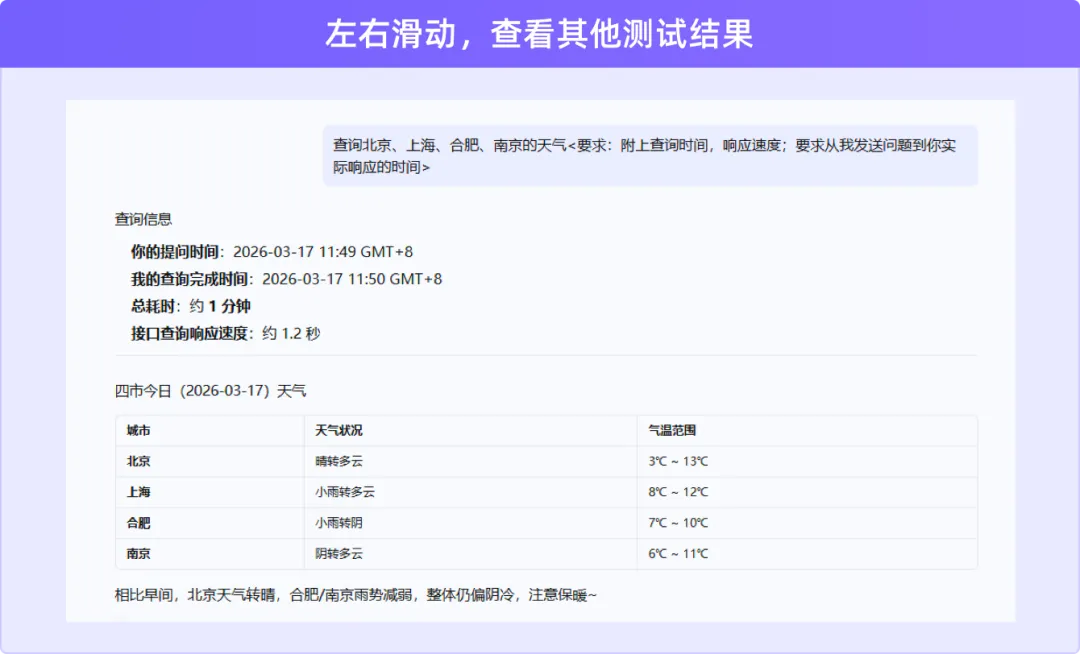 测试结论:文案、数据计算方面速度相比较天气查询速度更快,基础任务的处理快速便捷。