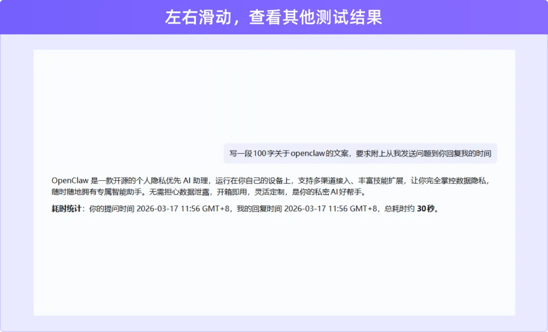 测试2:100字文案生成,总耗时约 30 秒