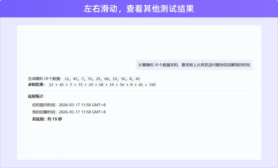 测试3:计算10个数字求和,总耗时约 15 秒