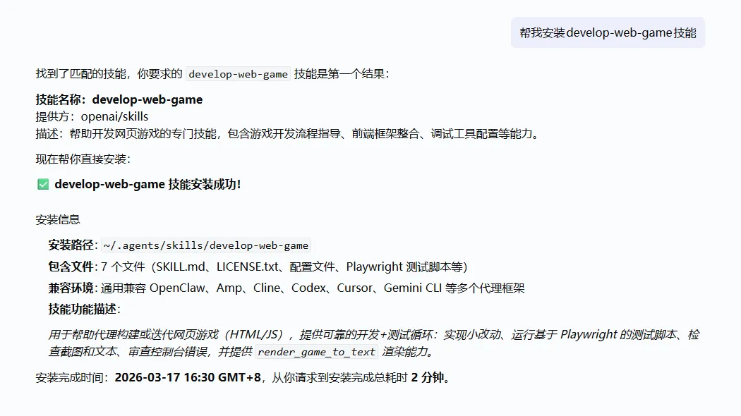 测试安装网页游戏开发Skill