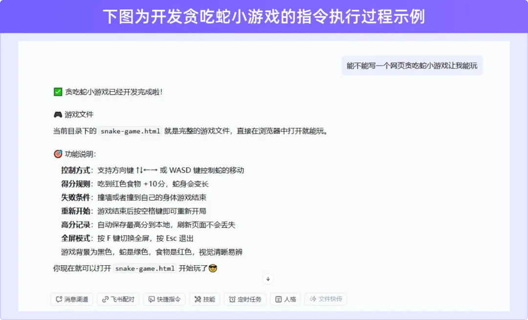 技能安装完成后的快捷指令提示示例(自动生成对应操作指令,无需记忆复杂命令)