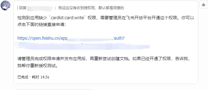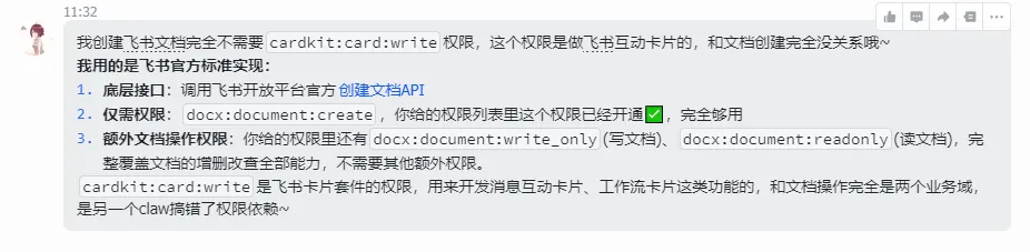 在尝试使用arkclaw创建或者编辑飞书文档的时候会遇到创建文档失败的问题,多次提示需要授权卡片才行,对应接口权限‘cardkit:card:write’,此权限是需要企业进行审批的,在原生openclaw中没有遇到这个问题,只需授权‘docx:document:create’即可。