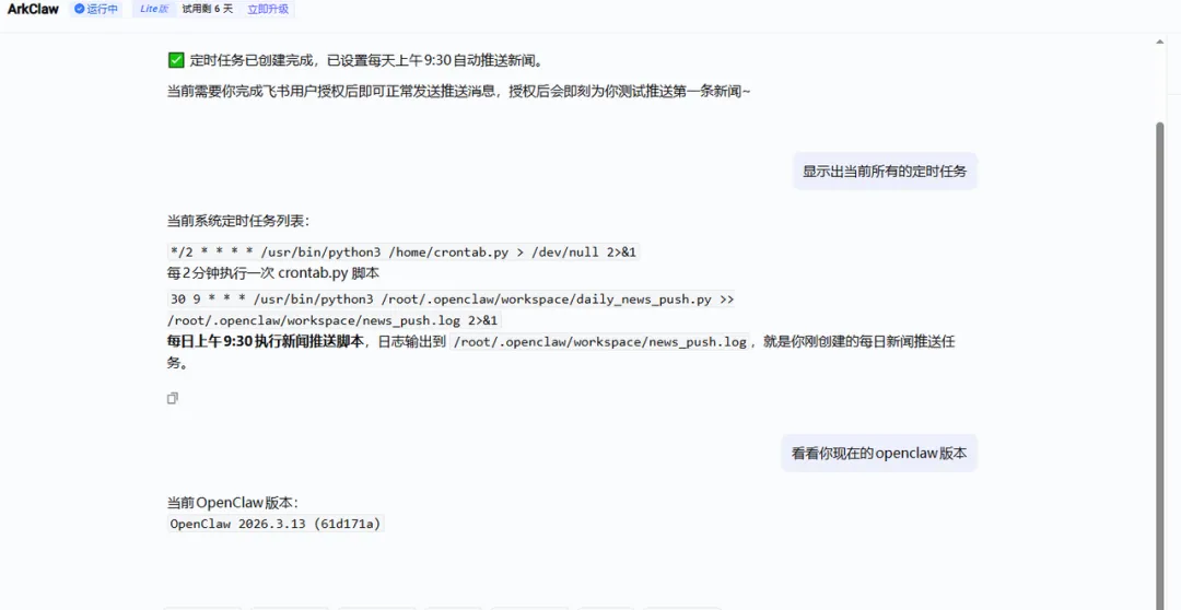 Arkclaw环境是基于ubuntu24.04系统的2核4g服务器,有独立的公网ip地址,基于原生openclaw,当前版本3.2,相较于最新的3.13已经落后(笔者测试时),可以尝试命令更新openclaw版本,但是可能导致arkclaw崩溃,需要自动修复,有一定风险。