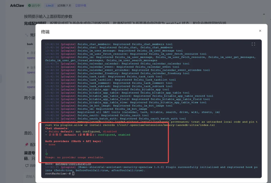 测试发现配对码不支持同时给多个channel使用,如果在已配对飞书的情况下再使用配对码去配对企业微信会导致飞书断连,显示not configured,disable,此时需要对飞书进行单独配置openclaw configure,操作如下: