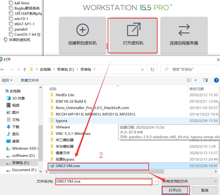 虚拟机软件VMware安装完成后,根据操作系统下载对应操作系统的GNS3虚拟机,解压后文件名为GNS3 VM.ova,如下图所示。然后在VMware中导入虚拟机文件。
