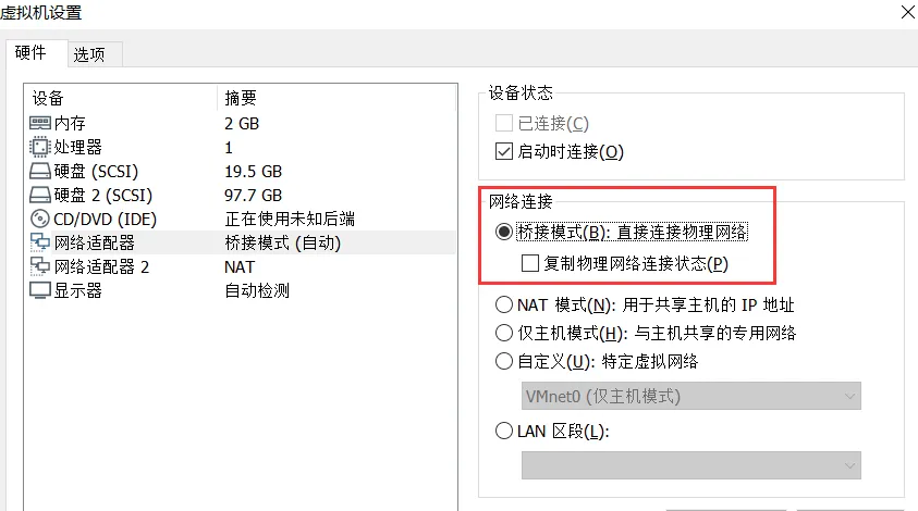 下面设置网卡连接模式,采用桥接模式