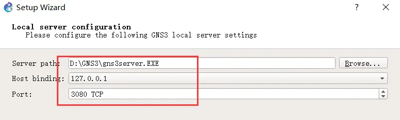 选择本地服务器的 IP 地址和端口。当安装了虚拟机后,会出现多个 IP 地址,请选择连到物理网络(如校网)的 IP,建议选择 127.0.0.1,这样当网络环境发生变化时,仍然能够连接到 GNS 虚拟机。请检查默认的端口是否被其他程序占用,如果被占用,更换一个端口或者退出占用该端口的那个程序。