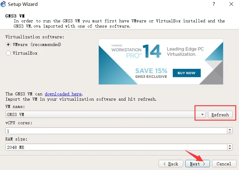 选择虚拟机。VM name 中会自动出现前面安装好的 GNS3 VM,如果之前忘了安装,这时也可以按照第二节导入虚拟机后,再按 Refresh。