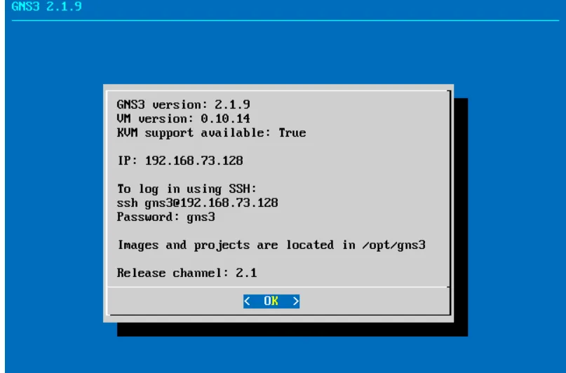 点击 Next 后,等待虚拟机启动完成。虚拟机成功启动后的界面如下,显示了本机的 IP 地址等信息(后面基本不需要操作这个虚拟机):