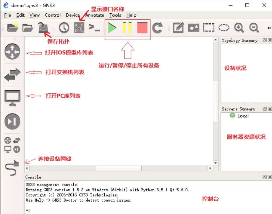 进入主界面后,左边一排按钮主要有打开/关闭 IOS 模型库列表、打开/ 关闭 PC 库列表、连接设备网线等操作