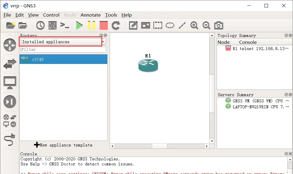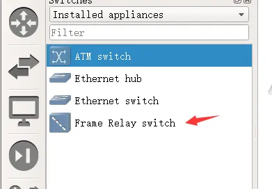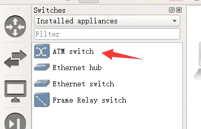点击图标,打开 IOS 模型库,会出现很多型号,但大部分都没有安装映像文件,所以还不能使用。在 Routers 的下拉列表中选中 Installed appliances, 只显示已安装映像文件的设备。