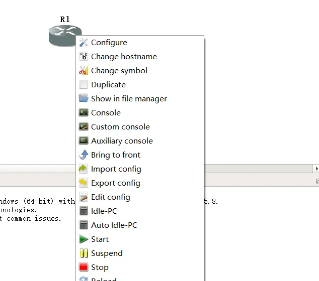 用鼠标拖动其中一个设备到中间的窗口,就自动添加了一台设备。在设备上点击右键,出现菜单。可以进行配置、进入 Console 口、启动/停止。