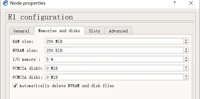 首先要停止设备运行,然后在设备上点击右键,从菜单中选择 Configure, 可以对设备进行配置。如果电脑内存比较少,可以适当减少给路由器配置的内存 (Memories and disks 中的 RAM size)。点击 Slots,可以增加或减少网络模块。