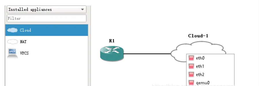 点击左边的 PC 图标,在列表中选择 Cloud,拖动到中间窗口。运行的服务器选择 GNS3 VM。