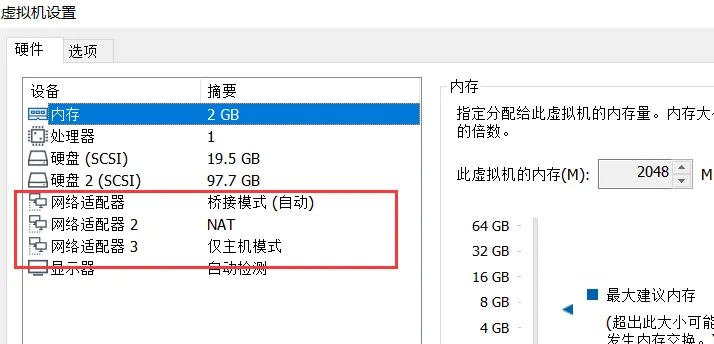 通过查看 VMware 虚拟机设置,我们看到默认情况下,虚拟机上安装了 3 张网卡,分别采用主机模式、NAT 模式和桥接模式(见下图)。