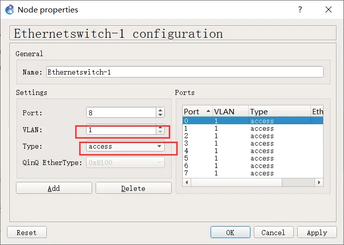 二层交换机功能比较简单,仅支持简易的 VLAN 设置。在 Switch 上点击鼠标右键,选择 configure 菜单功能,可以对交换机的各个端口设置所属的 VLAN, 也可以将端口设置成 Trunk 模式(选择 dot1q):