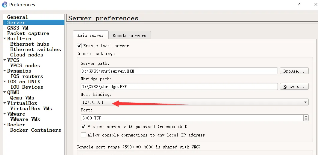 默认情况下,GNS VM 的第一个网络接口是使用主机模式的, IP 地址是通过VMware 分配的,如果对虚拟机环境重新配置过;或者当你在安装时选择的是物理网络接口的 IP 地址作为主机绑定地址,当物理网络环境发生变化后,GNS VM 的 IP 地址可能会变化,那么 GNS 软件就无法按照原来的 IP 连接到 GNS VM 机了, 此时需要进入 Edit-->Preference 菜单,修改 Server 的 Host binding 为新的 IP 地址。建议将这个地址改为 127.0.0.1,这样以后就不需要再改变了: