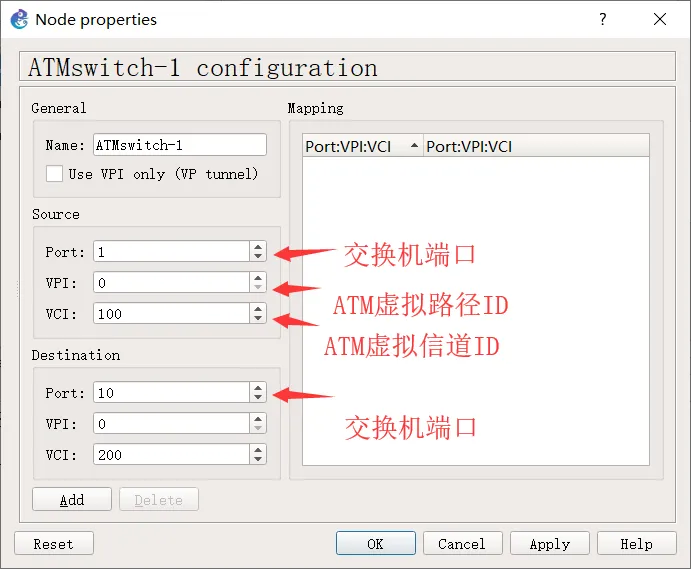 该 ATM 交换机功能比较简单,仅支持简易的隧道设置。在 Switch 上点击鼠标右键,选择 configure 菜单功能,可以设置隧道,一个隧道由一对源和目标构成,每个源或目标各由 Port、VPI 和 VCI 三部分构成,其中 Port 表示交换机的物理端口,可与路由器进行连接;