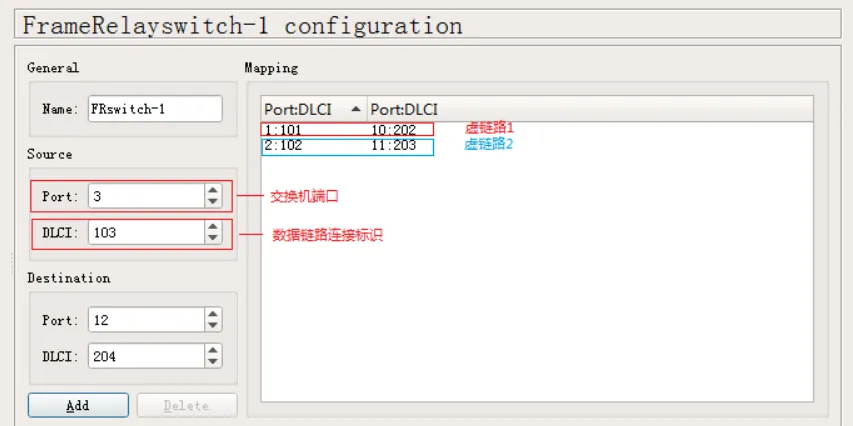 FR 交换机功能比较简单,仅支持简易的数据链路设置。在 Switch 上点击鼠标右键,选择 configure 菜单功能,可以设置数据链路,一个数据链路由一对源和目标构成,每个源或目标各由 Port、DLCI 二部分构成,其中 Port 表示交换机的物理端口,可与路由器进行连接;在 FR 中,DLCI 表示数据链路连接标识(Data Link Connection Identifier)。