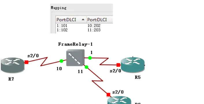 数据链路一旦建立,路由器或其他交换机就可以连接 FR 交换机的端口了。根据需要,可以建立多条数据链路。一个物理 Port 可以创建多条具有不同 DLCI 的数据链路,然后利用子接口进行配置, 例如下图中 R5 连接 Port 1,可以创建2 条数据链路连接 R7、R9,分别为 1:101-10:202, 1:102-11:203。
