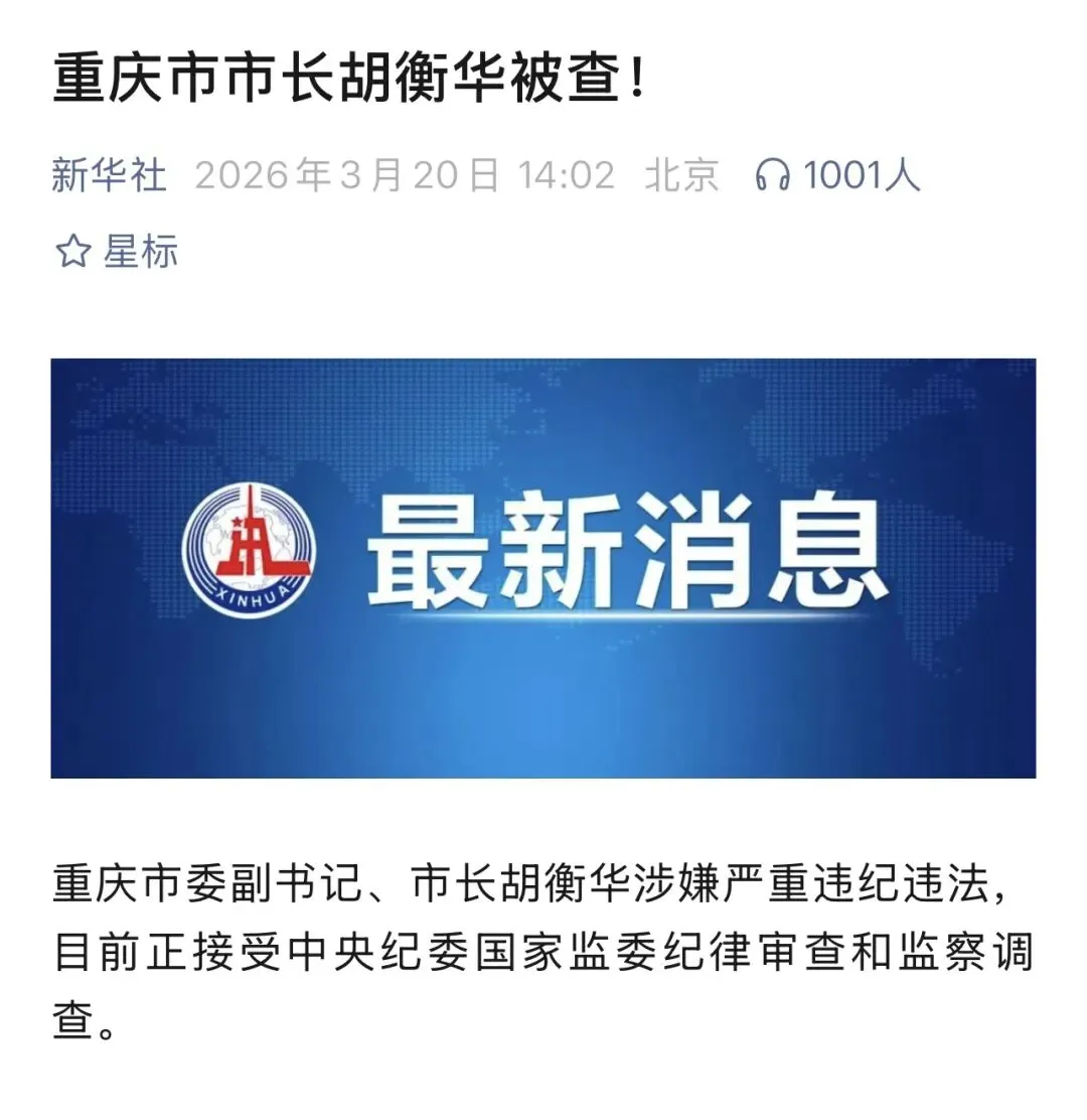 今天新华社报道,重庆市委副书记、市长胡衡华接受纪委调查。我查了胡衡华的履历,他2021年底到重庆市做市长,一直到现在被调查。