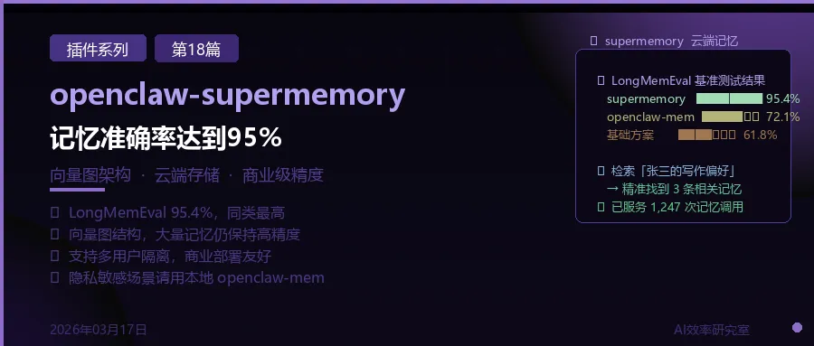 95.4%的记忆准确率,对于商业化AI部署来说是一个实质性的差距。如果你在构建一个需要大规模、高精度记忆能力的AI产品,supermemory是目前插件生态里最好的选项之一。