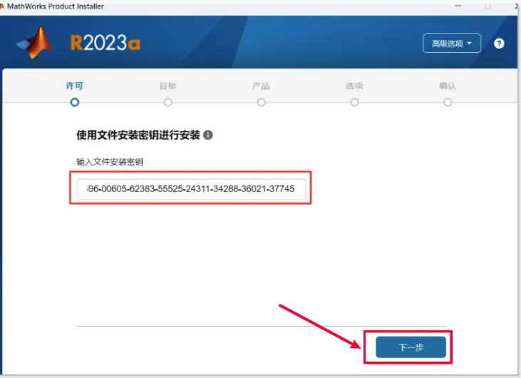 6.输入文件安装密钥【17704-65516-28949-05196-27677-58153-52675-25427-40932-65107-12325-01750-10518-09536-46547-49184-48288-09956-47596-00605-62383-55525-24311-34288-36021-37745】,点【下一步】。