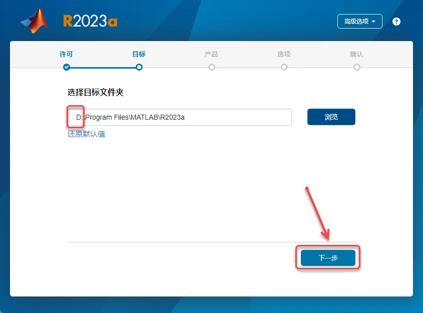 10.将目标文件夹位置从C盘改动D盘,再点【下一步】。