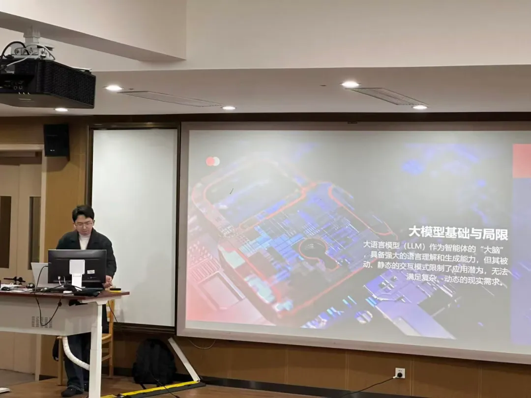 杨帆学长围绕“智能体赋能领域创新”这一主题展开,首先通过实操的形式,向同学们演示完成Agent环境的搭建。在此基础上,聚焦深度渗透与业务融合,鼓励参与者结合科研、开发等领域,探讨如何让Agent从辅助工具升级为协同伙伴,例如构建领域知识库增强问答、设计自动化工作流串联多任务、或开发轻量级Agent应用解决具体痛点。
