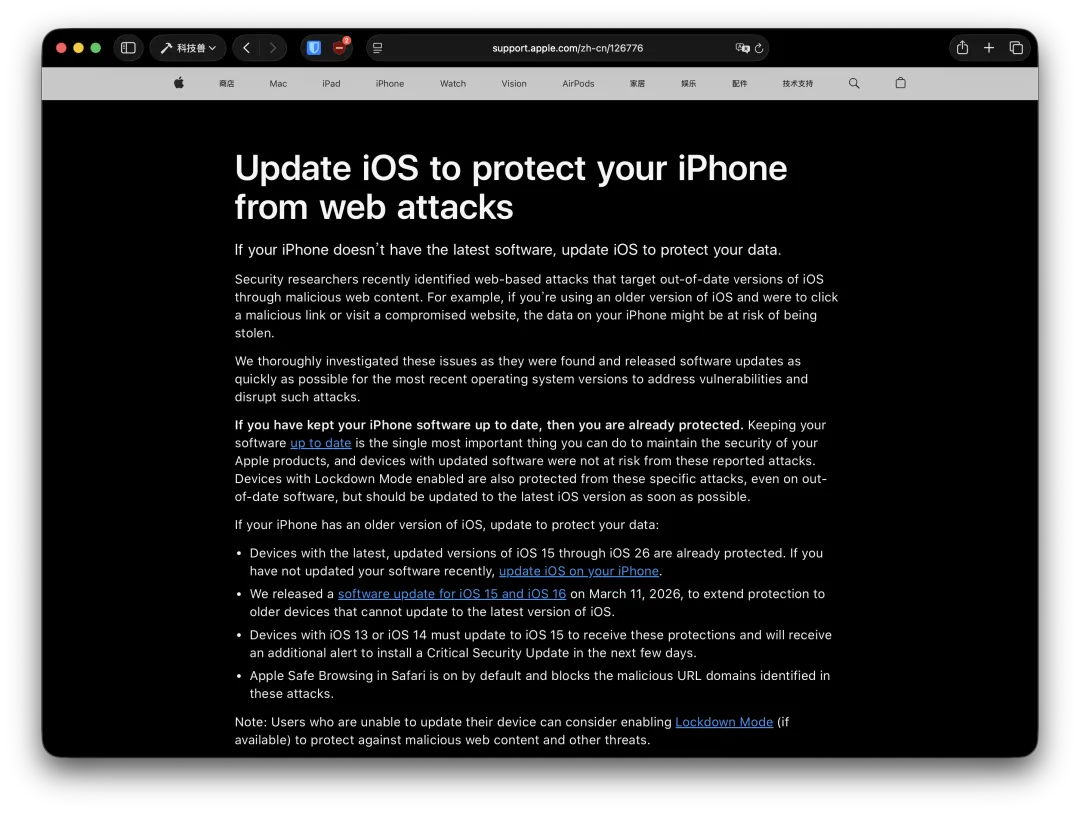 在 2026 年 3 月 11 日,苹果发布了 iOS 15.8.7、iOS 16.7.15 等更新。目前,安装最新版 iOS 15 到 iOS 26 的设备已经受到保护(支持 iOS 17 的设备均可升级 iOS 18),当前的最新版本包括: