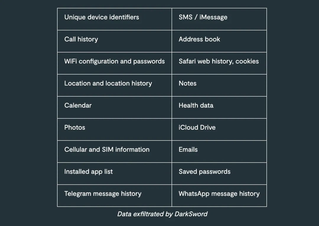 根据 Lookout 的分析,DarkSword 并非用于长期监控,而是在短时间内完成数据收集与窃取后即自动清理痕迹并退出,整个过程可能只持续几分钟(取决于数据量)。
