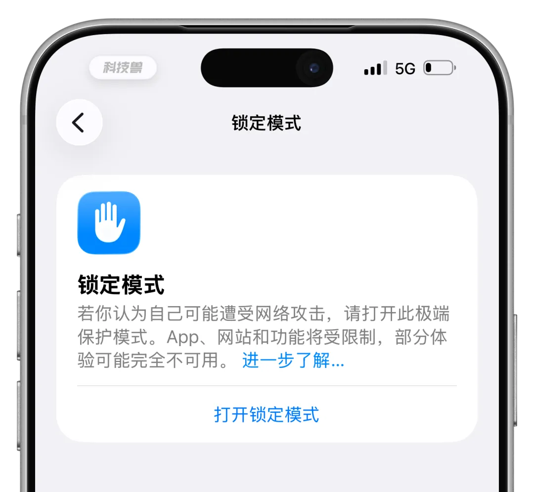 对于无法升级系统的设备,也可以考虑开启「锁定模式」(iOS 16 及以上提供,仅建议高风险人群使用),以防御恶意网页攻击。