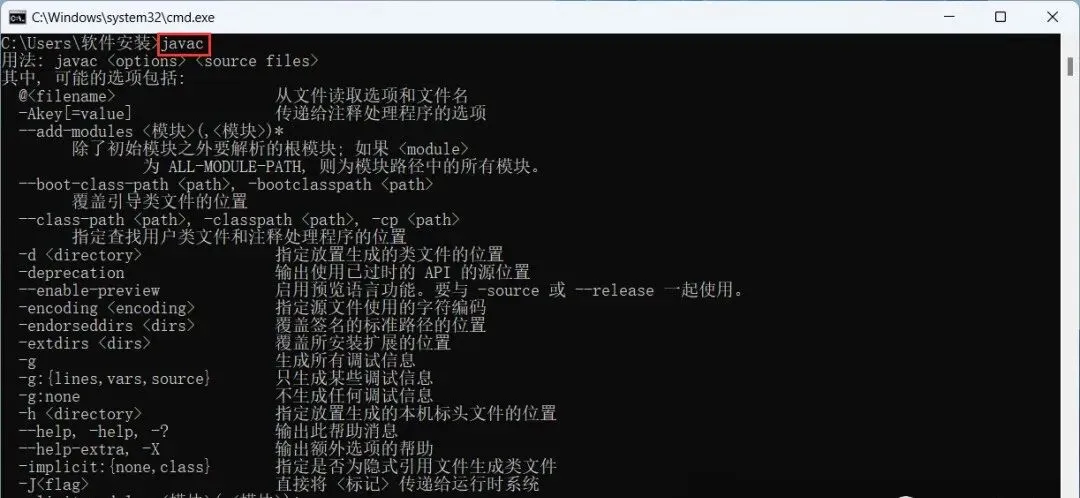 11、输入:javac,得到下列反馈,按下键盘上的【Enter】回车键,则JDK安装及配置成功