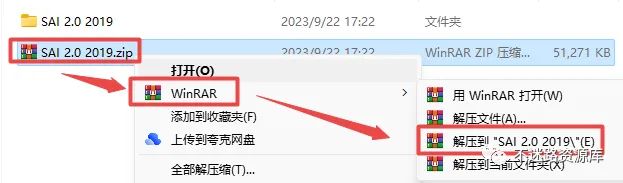 1.选中下载的压缩包,然后鼠标右键选择解压到“SAI 2.0 2019”(没有解压选项点这里)