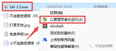 2.打开刚刚解压的文件夹,鼠标右键点击“SAI 2.0.exe”选择“以管理员身份运行”