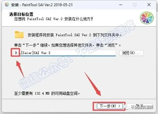 3.选择软件安装路径,建议和教程中的保持一致,本例安装到D盘(将路径地址中的首字符C改为D表示安装到D盘,安装路径不要出现中文),点击“下一步”