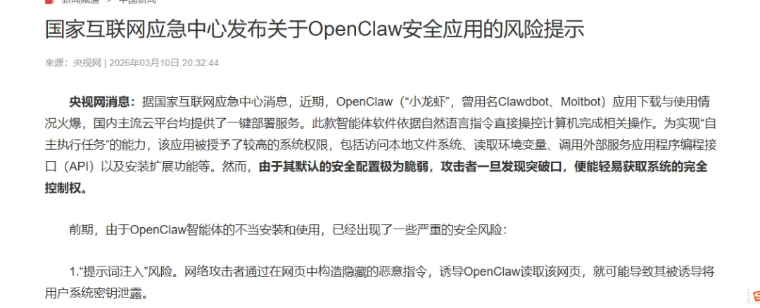 OpenClaw称得上当下技术圈的新宠,人人都在喊着“养龙虾”。甚至专门有提供安装openclaw的服务,由此可见AI对当下的工作生活方面的引领和推动效应。AI的效率化提升一方面,让技术圈奔腾,看到从AI从生成内容为核心的大模型到智能体干活的落地,就好像身边的军师变成了一个助手,科幻照进现实,大大解放了传统生产力。另一方面,从公开的渠道可以看到OpenClaw做为AI初阶智能体,存在大量的风险和漏洞,在推广使用上需审慎。
