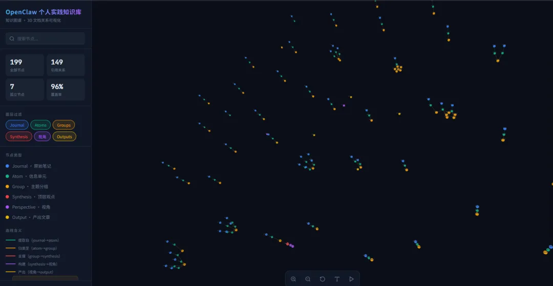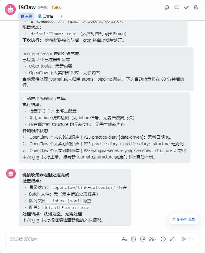 每次我往文件夹里丢几篇新笔记,JS_CLAW 自动跑一遍完整的金字塔流程。知识体系就这么一点点自己"长"出来了。