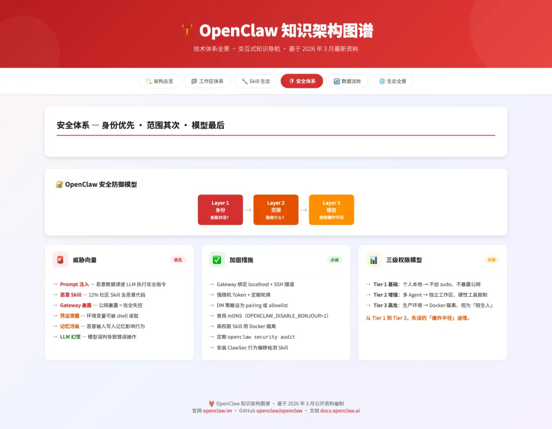 OpenClaw 的安全设计围绕“身份优先 · 范围其次 · 模型最后”的三层模型展开: