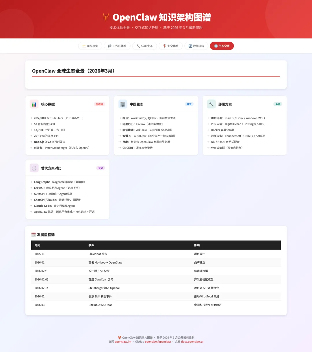 GitHub Stars:28.5 万+,创下历史记录。 官方 Skill:53 个,社区 Skill 超过 1.37 万。 支持平台:20+ 消息渠道。 创始人:Peter Steinberger(已于 2026 年 2 月加入 OpenAI)。