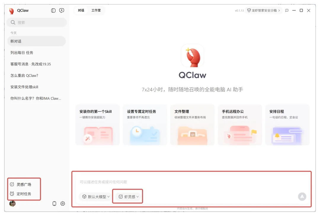 2.电脑上和它聊。 打开电脑上的QClaw,对话框里直接打字下命令。里面有现成的“灵感广场”,一大堆模板可以直接用或微调。