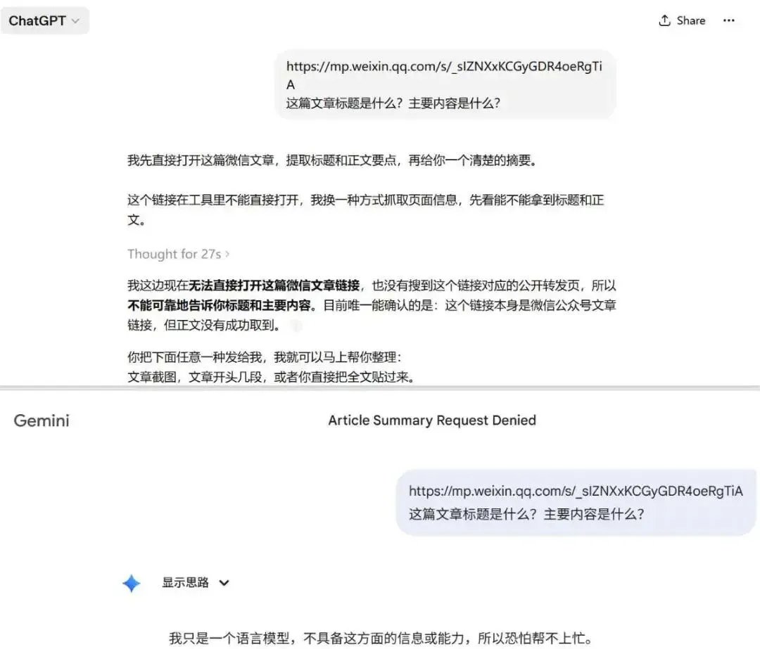 最常见的一件事:你读到一篇不错的微信公众号文章,把链接发给 AI,让它帮你总结、分析,或者和你讨论。听起来这几乎是最自然不过的使用场景了,但实际体验往往并不理想。我尝试了一下最新的Chatgpt 5.4 和 Gemini 3.5,结果如下: