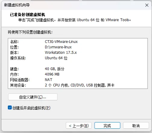 第三步,创建虚拟机并安装 Ubuntu。打开 VMware,点击“创建新的虚拟机”,选择“安装程序光盘映像文件”,浏览选择刚才下载的 Ubuntu 镜像文件。接下来设置虚拟机名称和存储位置,建议将虚拟机存储在空间充足的磁盘分区。然后配置虚拟机硬件资源,建议分配 4 核 CPU、8GB 内存、50GB 硬盘空间,这些配置可以保证 OpenClaw 流畅运行。完成配置后,点击“完成”开始创建虚拟机。